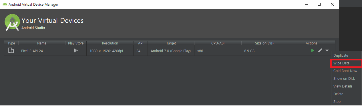 AVD설정에 들어가 Wipe Data를 눌러주면 간단하게 해결할 수 있다.