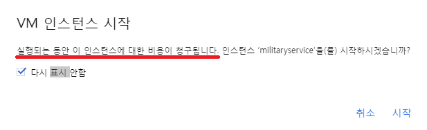 다시 시작하면 이렇게 비용이 측정된다는 경고문이 뜬다.