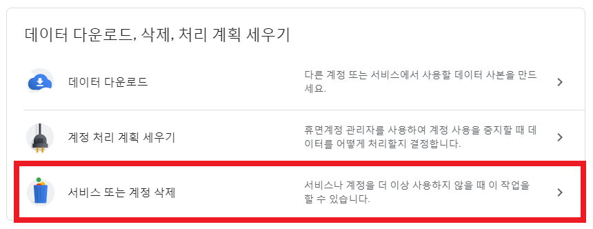 그중에 '서비스 또는 계정 삭제' 항목을 클릭해줍니다.
