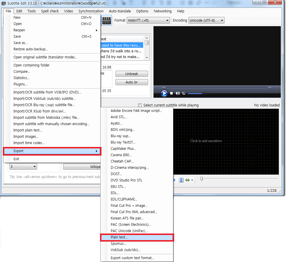 File -> Open 순서대로 들어가서 다운로드한 자막파일(.vtt)을 불러와줍니다.