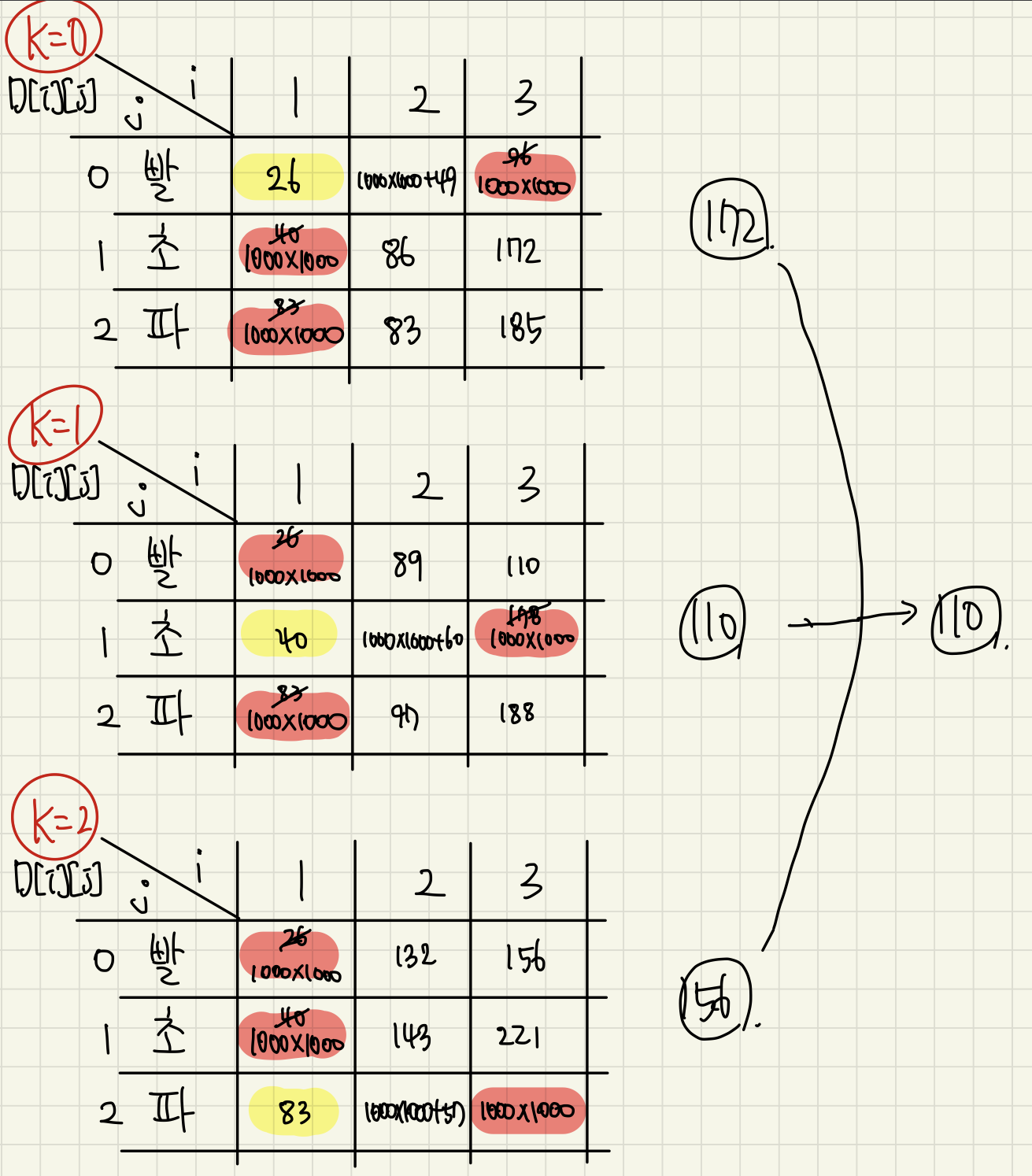 즉, n번째에 칠한 색(j)에 따른 비용의 최솟값(D[n][j])들을 비교하여 그중 가장 작은 비용이 답이 된다.