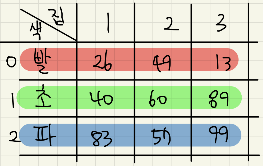 D[i][j] : i번째 집을 j색으로 칠한다고 했을 때 비용의 최솟값,