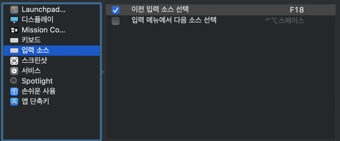 입력 소스 -> 이전 입력 소스 선택을 F18로 바꿔주면