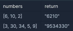 3. 모든 자리의 숫자가 같지만 자릿수가 다르다면, 자릿수가 같을 때까지 맨 앞의 수를 넣은 후 비교한다. 예를 들어서 382와 38을 비교했을 때, 382와 (38에 맨 앞 자릿수인 3을 붙인 383을 비교한다. 그렇게 하면 38382가 만들어지는데 이것은 다른 조합인 38238보다 더 큰 것을 알 수 있다.